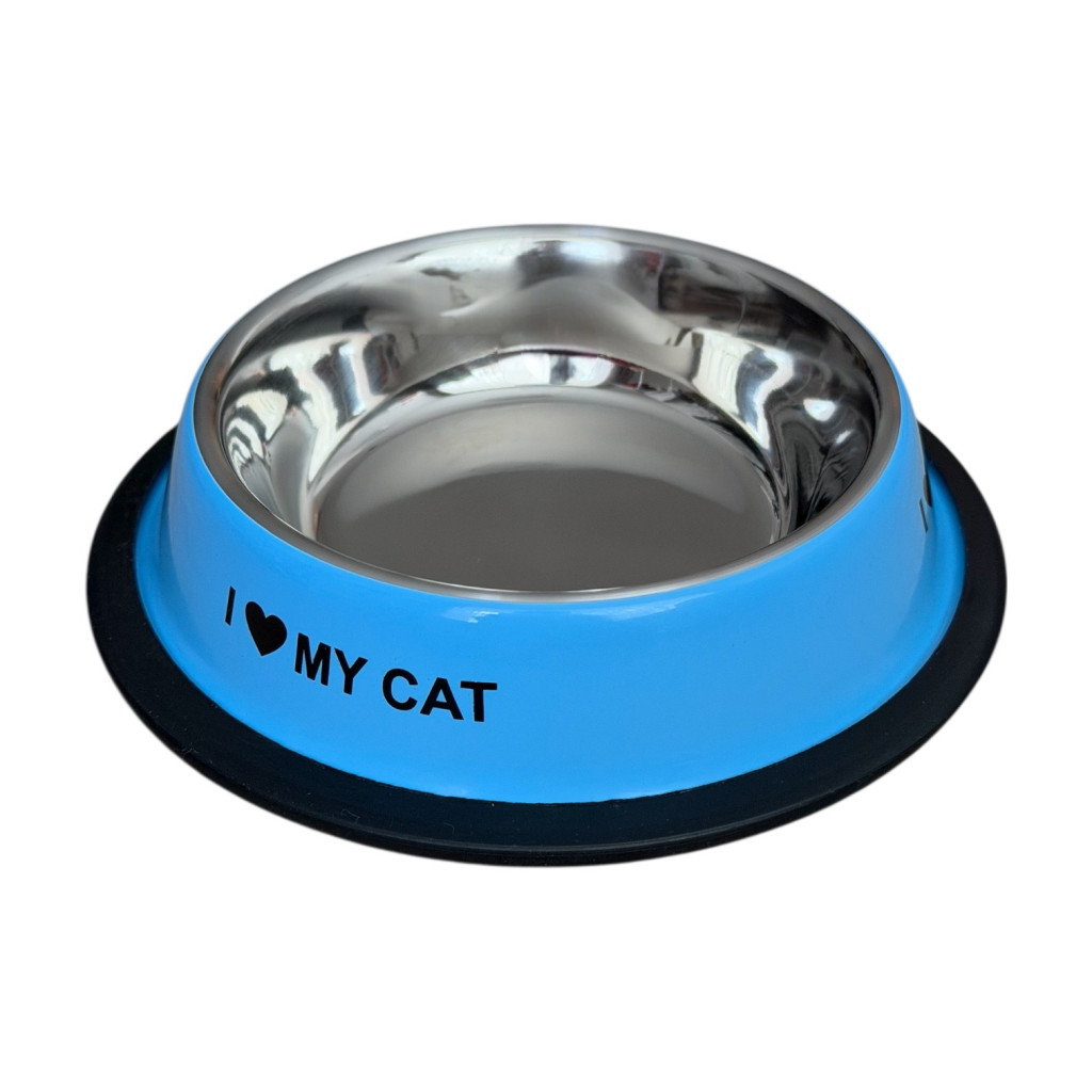 A tál belseje rozsdamentes acélból készült, amely könnyen tisztítható, szagtalan és ellenáll a baktériumoknak. A külső része modern, kék borítást kapott, amelyen a kedves “I Love My Cat” felirat található – valódi stílusos kiegészítő minden macskás otthonba.