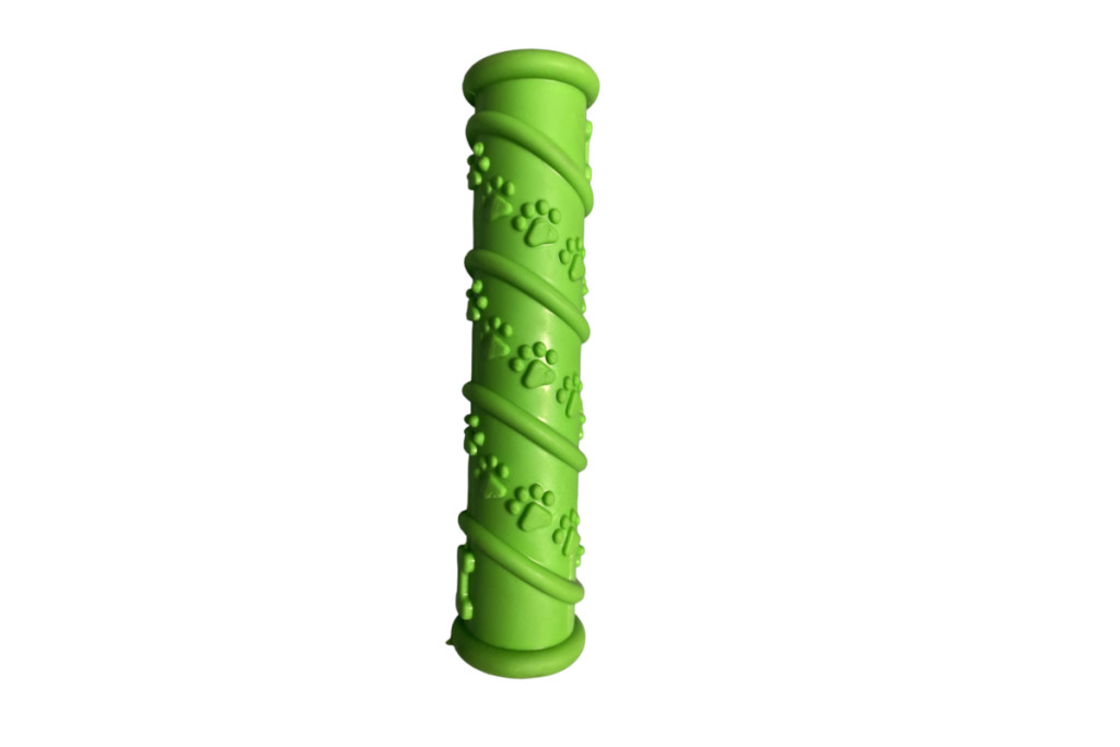 A gumiból készült, bordázott felület masszírozza az ínyt és segíti a fogtisztítást, így nemcsak szórakoztató, de hasznos is.
