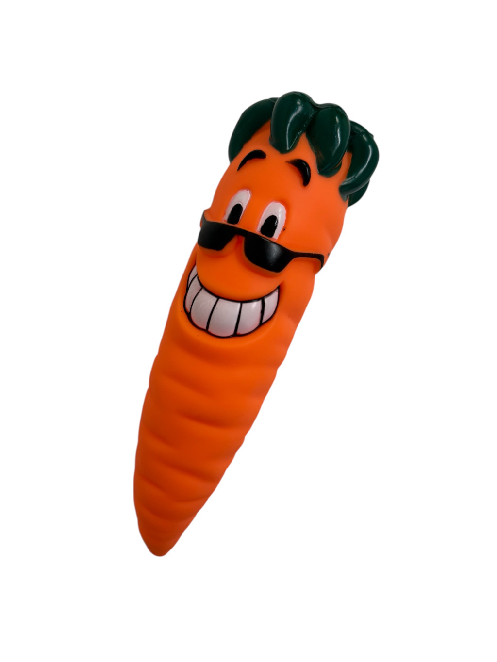 A napszemüveges répa figurája nemcsak vicces, hanem rendkívül ellenálló gumiból készült, így jól bírja a harapdálást és rágást.