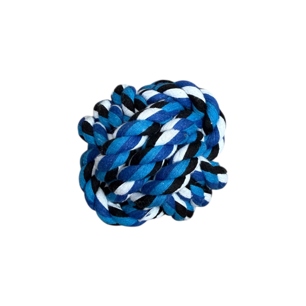 A masszívan elkészített csomó formájú labda könnyen megfogható és eldobható, a több színű (kék–fehér–fekete) mintázat pedig segít, hogy a kutya könnyen észrevegye játék közben.
