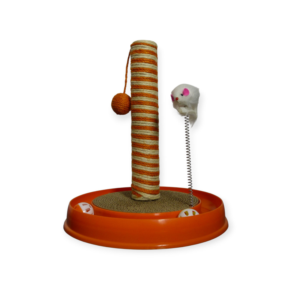 Többfunkciós macskajáték és kaparófa rugós egérrel és guruló labdákkal.