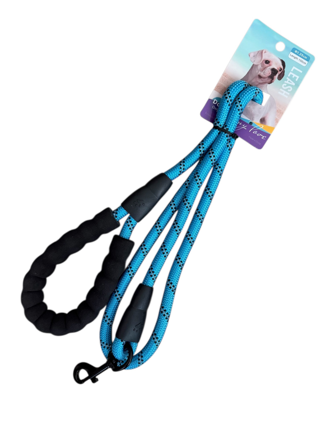 A fekete fém karabiner stabil, erős és megbízható, a póráz pedig modern, kék mintázatú kialakítást kapott. Tökéletes egyensúly a biztonság, tartósság és kényelem között.