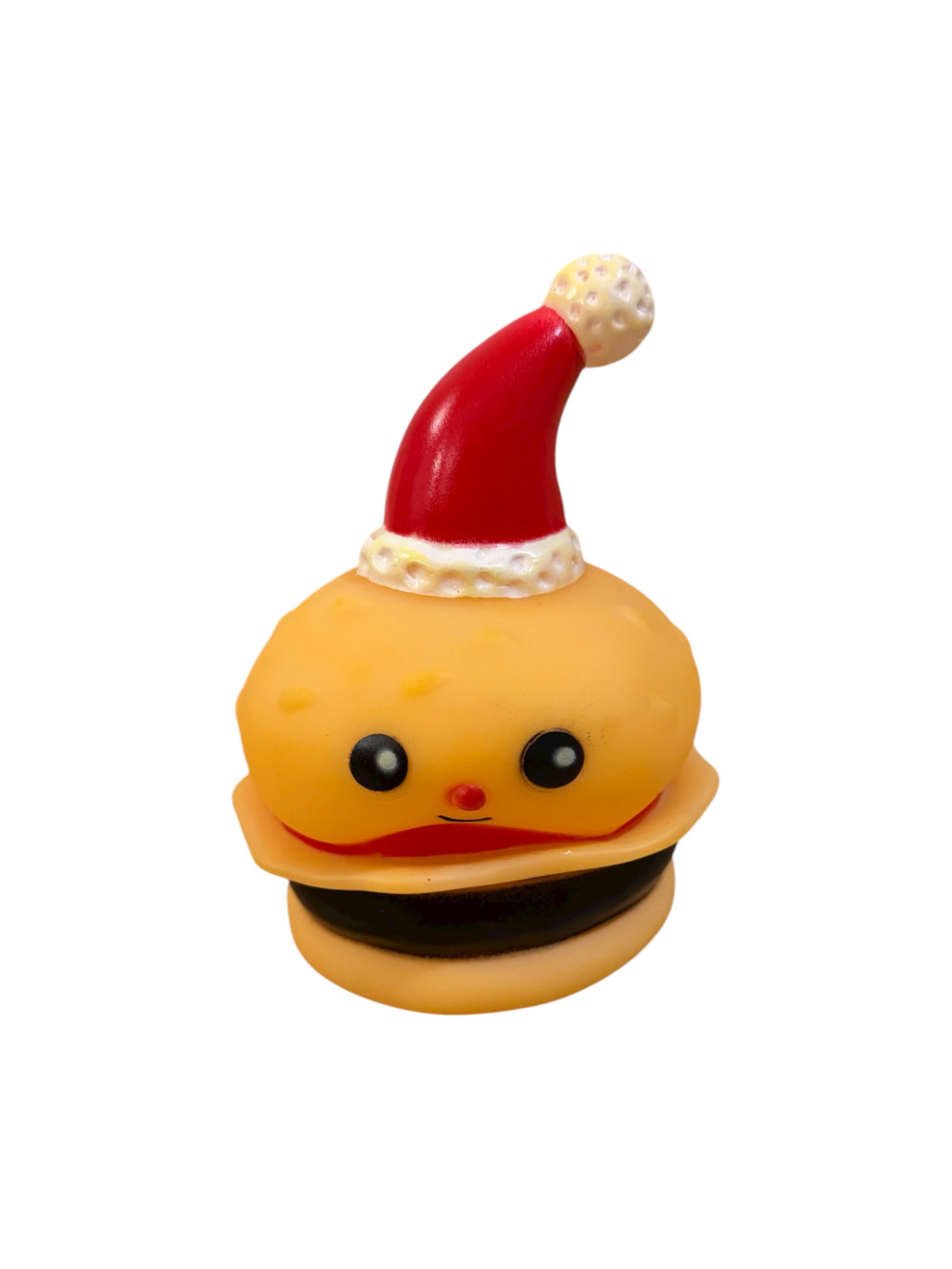 A hamburger formájú figura karácsonyi sapkát visel, így nemcsak aranyos, hanem remekül illik a téli hangulathoz is.