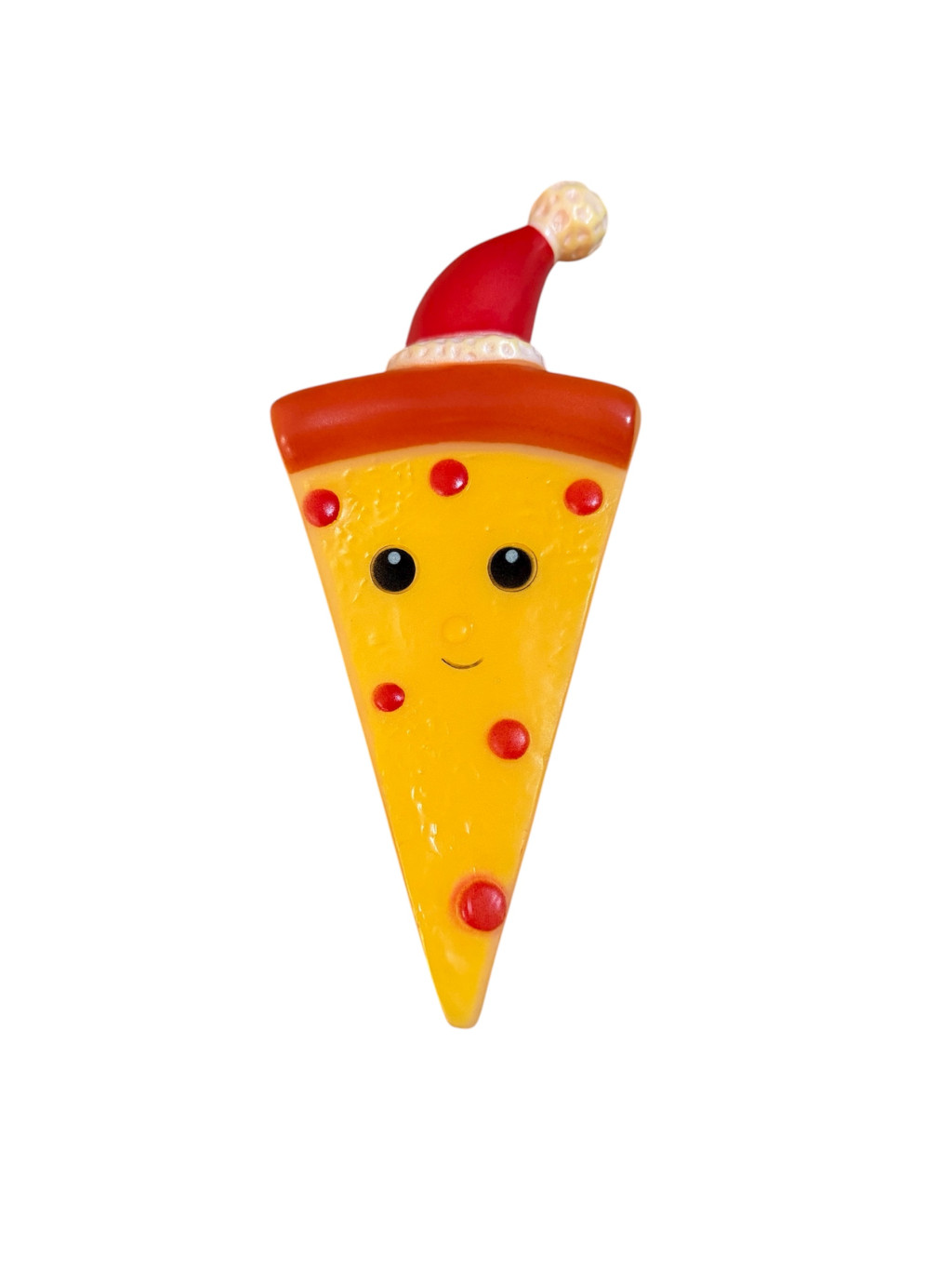 A pizzaszelet formájú, karácsonyi sapkás figura különleges dizájnnal és élénk színekkel hívja fel magára a figyelmet.