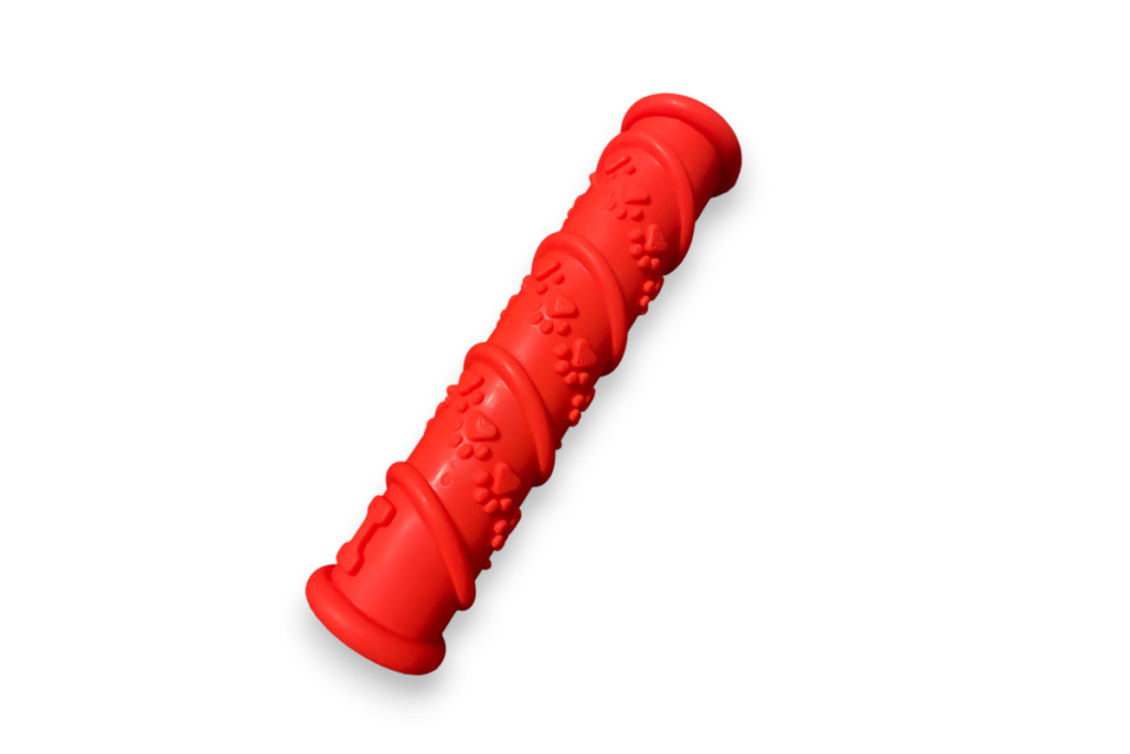 A gumiból készült, bordázott felület masszírozza az ínyt és segíti a fogtisztítást, így nemcsak szórakoztató, de hasznos is.